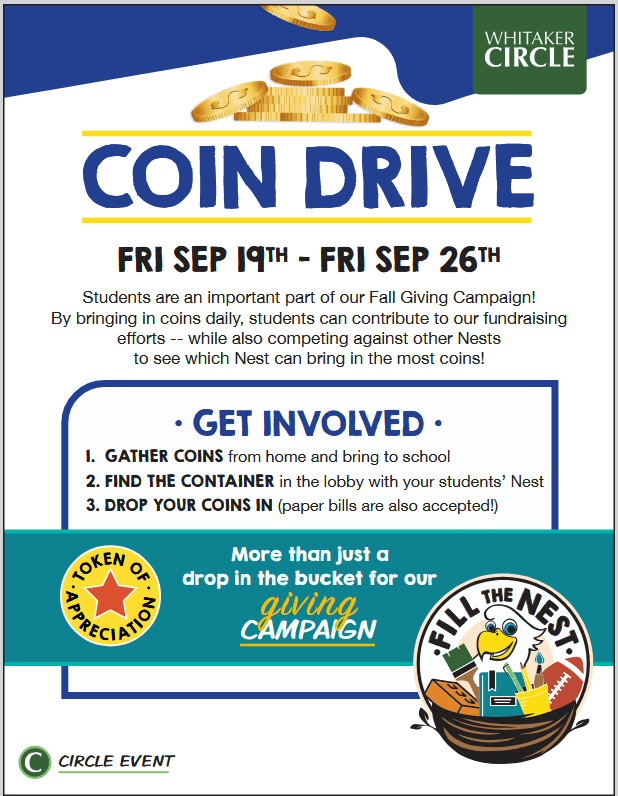 - Fill the Nest Coin Drive: Send coins with your student to school! This really works – we raise a lot of money in coins! This is a grade-level competition and the grade that raises the most money in coins is awarded a popsicle party.